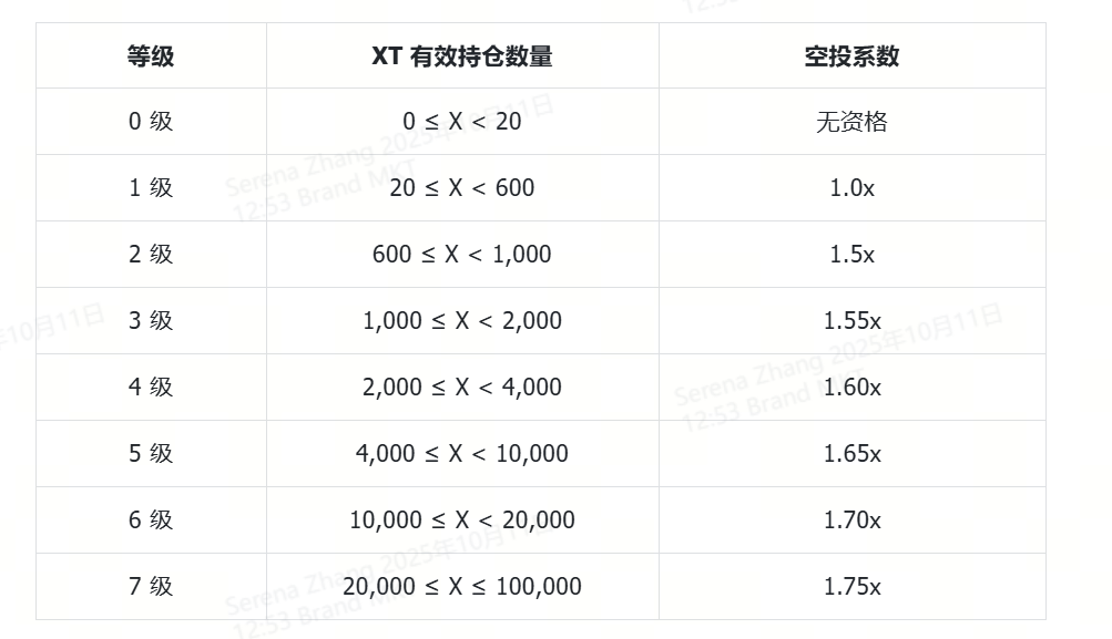 XT Airdrop has different levels from 1 to 7, corresponding to different airdrop coefficients. The more holdings you have and the higher your level, the higher the corresponding airdrop coefficient, and the more airdrop rewards you can ultimately receive.
