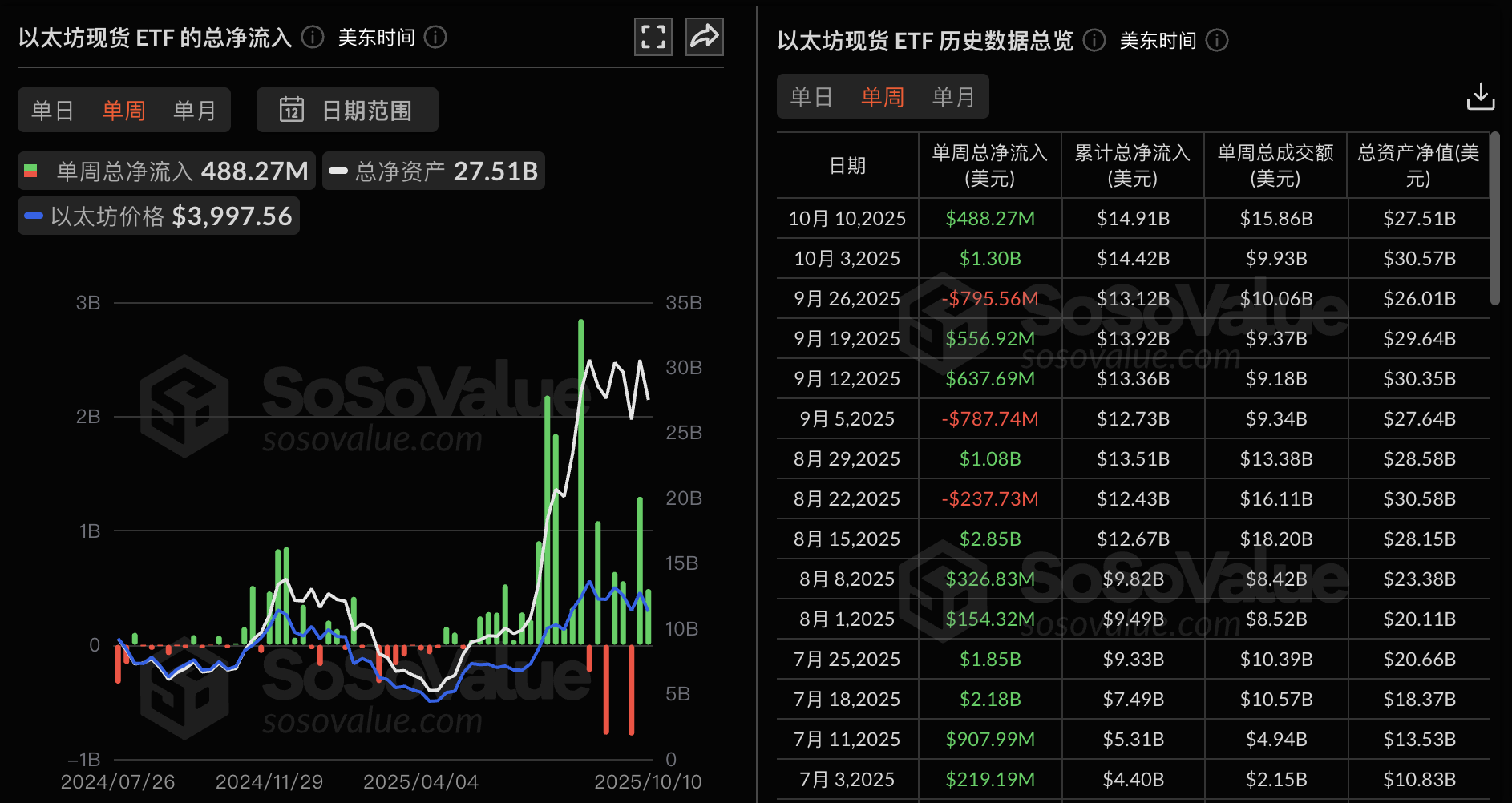 According to SoSoValue data from Odaily Planet Daily, the Ethereum spot ETF had a net inflow of US$488 million during last week's trading days (October 6 to October 10, Eastern Time).