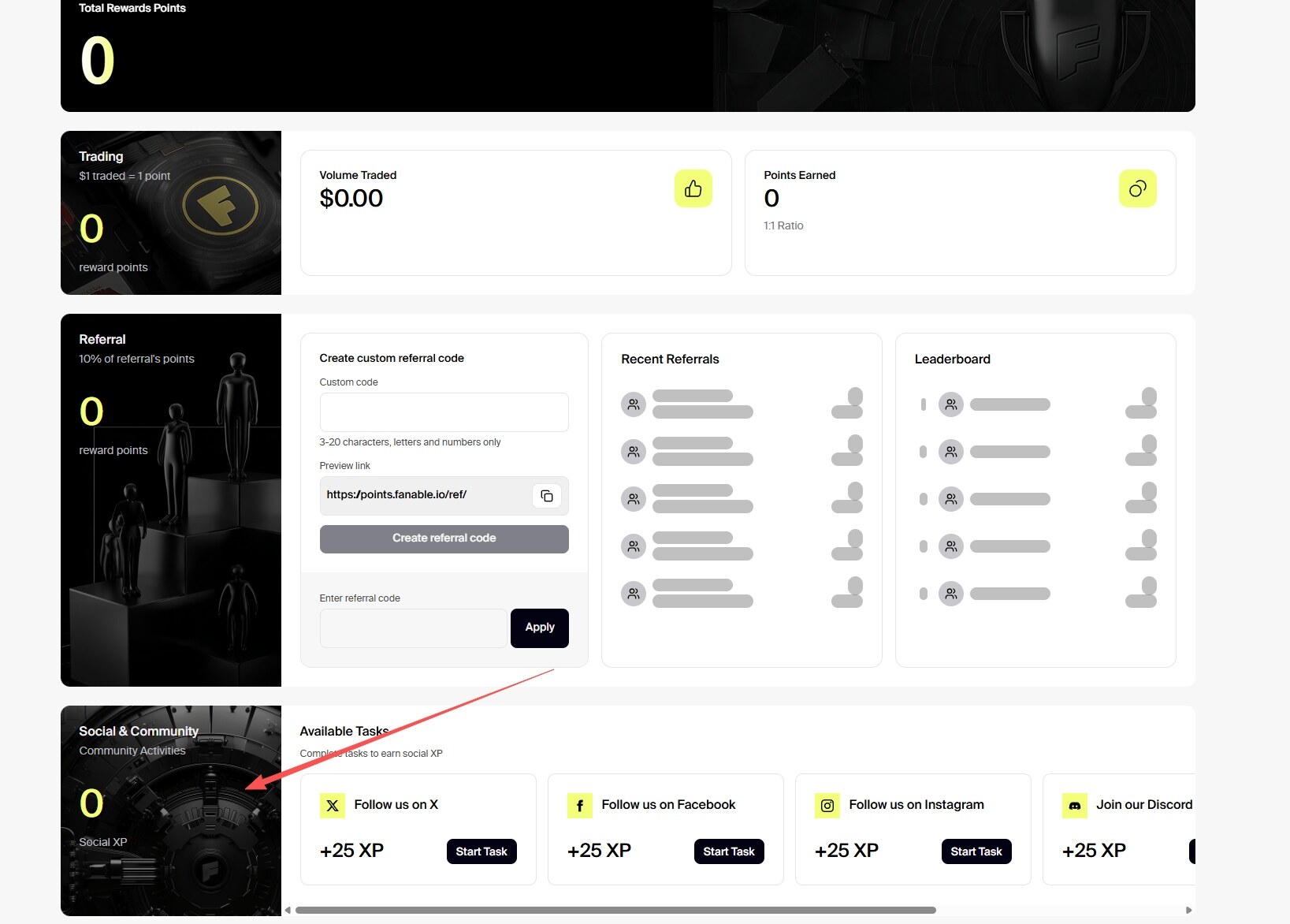 STEP 1. Go to the interactive website (link: https://points.fanable.io/ ), connect your wallet, and complete 5 social tasks to receive 125 XP points.