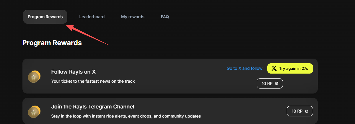 STEP 1. Visit the interactive website (link: https://app.fuul.xyz/landing/rayls-loyalty-rewards ) and log in with your Web3 wallet. After binding your X account in Task 1, follow the official account to earn 10 RP points. In Task 2, join the official TG community to earn another 10 RP points.