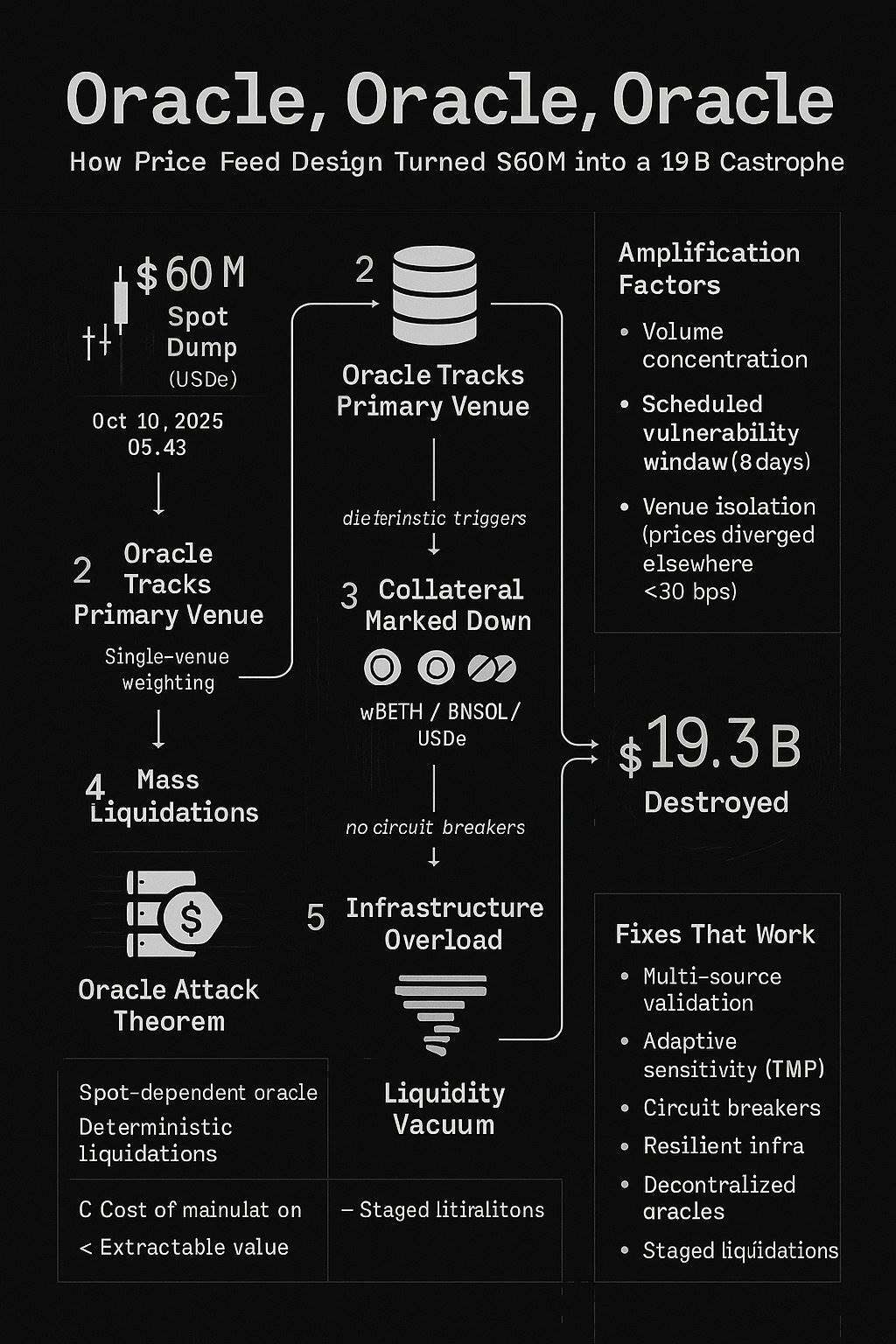 On October 10-11, 2025, a $60 million market sell-off destroyed $19.3 billion in value. This was not caused by a market crash or a cascading liquidation of truly damaged positions, but rather by an oracle failure.