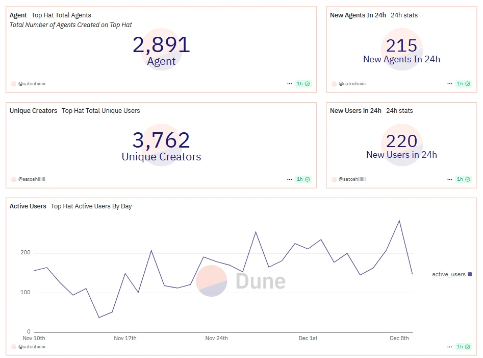 平台收入的 10% 将用于回购和销毁 HAT(TOP HAT)代币。HAT 未披露收入情况,但从 Dune 统计来看,目前项目仍在平稳运行当中。活跃用户数见下图最底部部分。