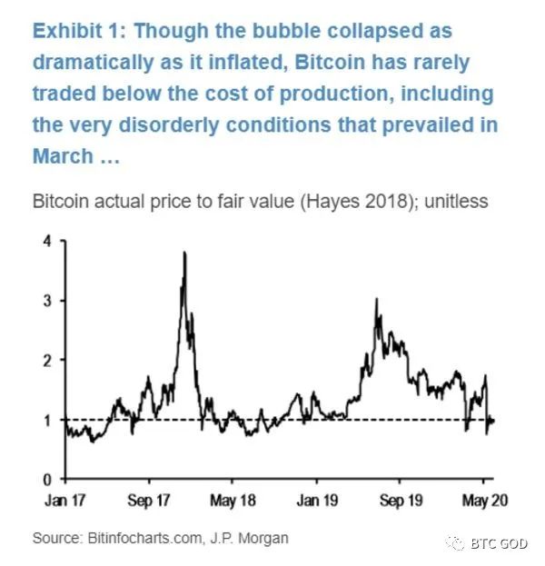 Vào đỉnh điểm của sự hoảng loạn vào tháng 3, định giá của Bitcoin không khác nhiều so với mức nội tại của nó, nghĩa là ngay cả khi sự biến động gia tăng, giá trị của Bitcoin chỉ thấp hơn một chút so với chi phí khai thác.