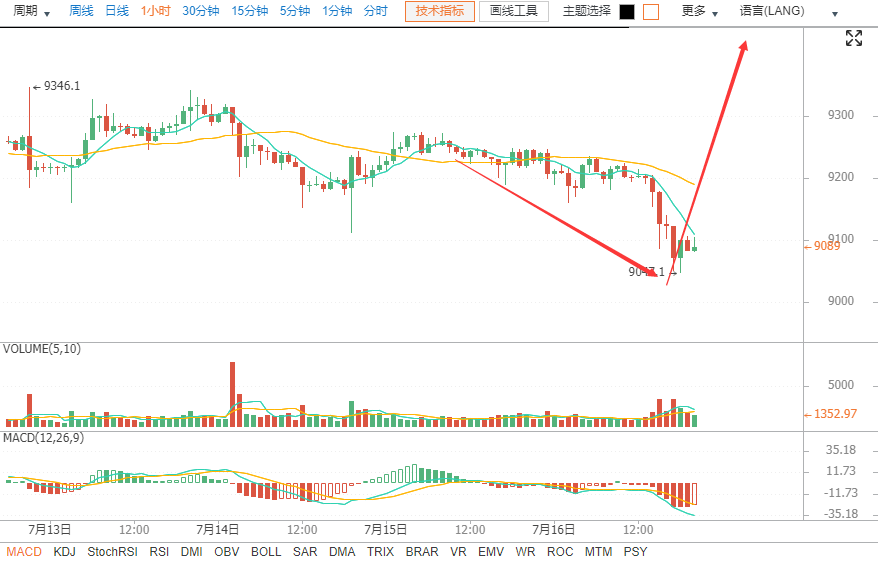 Trong biểu đồ bốn giờ, Dải bollinger mở ra và thị trường dần dần trượt từ gần đường giữa của Dải bollinger xuống gần đường dưới của Dải bollinger và hiện tại là 9102; tất cả các đường trung bình động đều đi xuống và điểm bán trên liên tục di chuyển xuống; hình ảnh đính kèm Trong số đó, đường nhanh và chậm của MACD đang chạy gần trục 0, cho thấy trạng thái dead fork; cả RSI và Stoch đều đang chạy với V và BTCGOD22 giảm khối lượng; có thể thấy rằng xu hướng thị trường ngắn hạn cũng bị chi phối bởi các cuộc gọi lại. Điểm hỗ trợ tại 9000 và điểm kháng cự tại 9250.