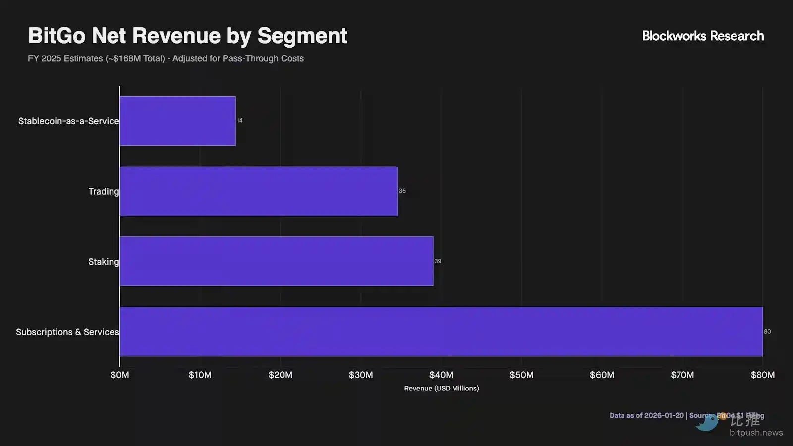 Theo dữ liệu biểu đồ từ Blockworks Research, doanh thu kinh tế cốt lõi của BitGo (loại trừ phí đại lý và chi phí pass-through) trong năm tài chính 2025 ước tính khoảng 195.9 triệu USD. Trong đó, kinh doanh đăng ký đóng góp phần lớn doanh thu định kỳ có lợi nhuận cao, với 80 triệu USD, chiếm gần 48% tổng doanh thu ròng. Phần doanh thu này chủ yếu đến từ phí định kỳ mà BitGo thu từ hơn 4,900 khách hàng tổ chức.