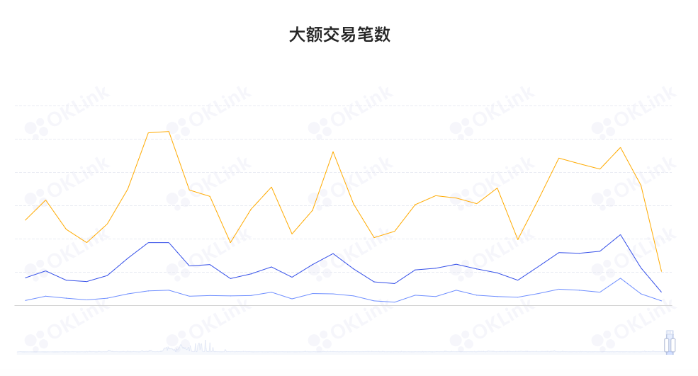 OKlink dataIt shows that the number of on-chain transfers rose sharply last week, with "above 1,000 ETH", "above 2,000 ETH" and "above 5,000 ETH" rising by 25%, 40%, and 67% month-on-month, respectively. The trading enthusiasm of giant whales has increased significantly.