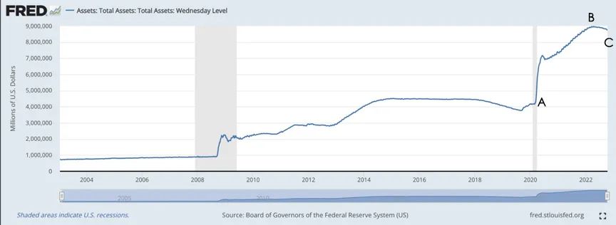 美联储的主要任务包括控制通胀和保证就业,为缓解疫情对经济和就业的冲击,美联储在20年3月开启了量化宽松的印钞模式,水龙头进水的阀门打开,注入巨量的水源推升了水位,资产价格的飙升带来了包括美股、数字货币等全球金融市场的牛市,商品价格的水涨船高也带来了高通货膨胀率。在下图A—B点,美联储总资产规模持续攀升,BTC也迎来了3800-69000美元的牛市。