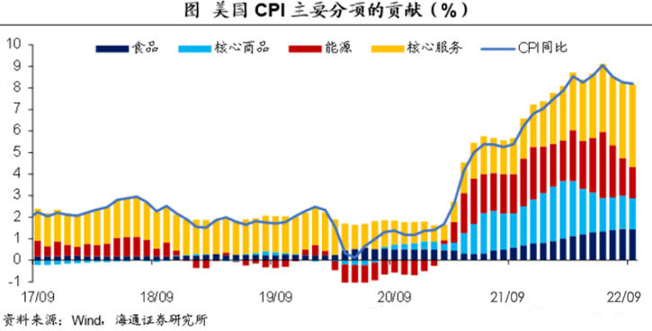 美国CPI的构成分为能源、食品、核心商品和服务几大项:能源方面,布油已从年初的120美元降至89美元;食品及商品方面,主要粮食产品的大宗价格正在走低、阻塞的供应链逐渐恢复,进口指数和家庭支出增速预期也都大幅降低。剖析目前美国通胀持续高烧不退的原因,房租和服务项是美国核心通胀上行的主要驱动力。