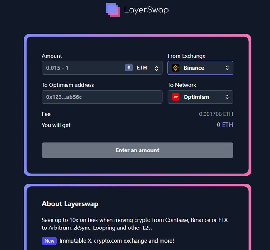 Layerswap เป็นเครื่องมือสำหรับการถอนสินทรัพย์ที่เข้ารหัสโดยตรงจากการแลกเปลี่ยนแบบรวมศูนย์ (CEX) ไปยังเครือข่ายเลเยอร์ 2 ซึ่งพัฒนาโดย Bransfer ซึ่งเป็นผู้ให้บริการพื้นฐานสำหรับการชำระเงินแบบเข้ารหัส