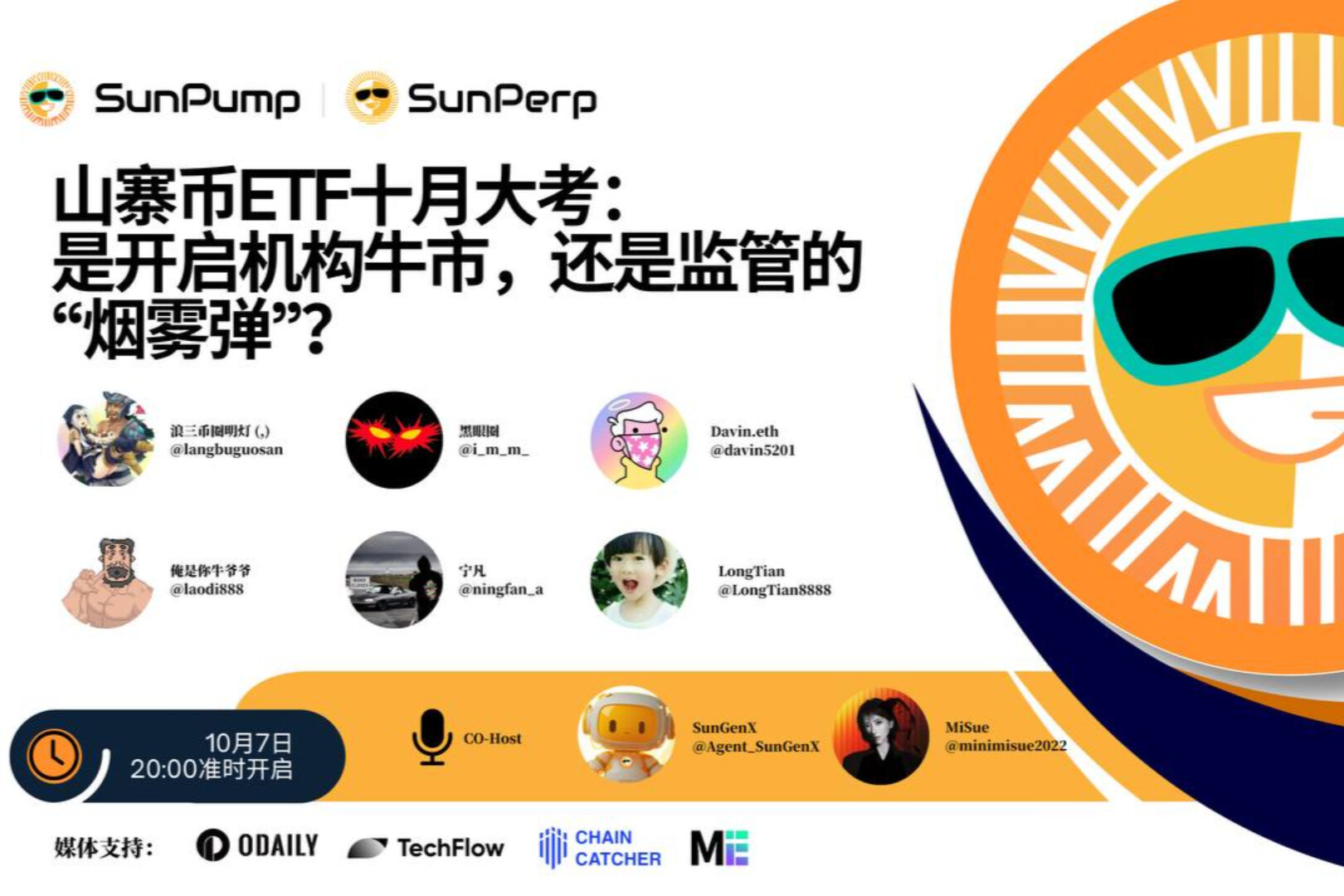 At 8 PM on October 7th, a special SunFlash roundtable will be livestreamed via Twitter Space, featuring industry experts who will comprehensively analyze the capital logic and policy signals behind the ETF narrative, focusing on regulatory policies, institutional preferences, and liquidity cycles. Follow the official accounts @sunpumpmeme and @Agent_SunGenX, retweet the tweet, and @ three friends. Five lucky participants will be selected and each will receive a 10 USDT reward.