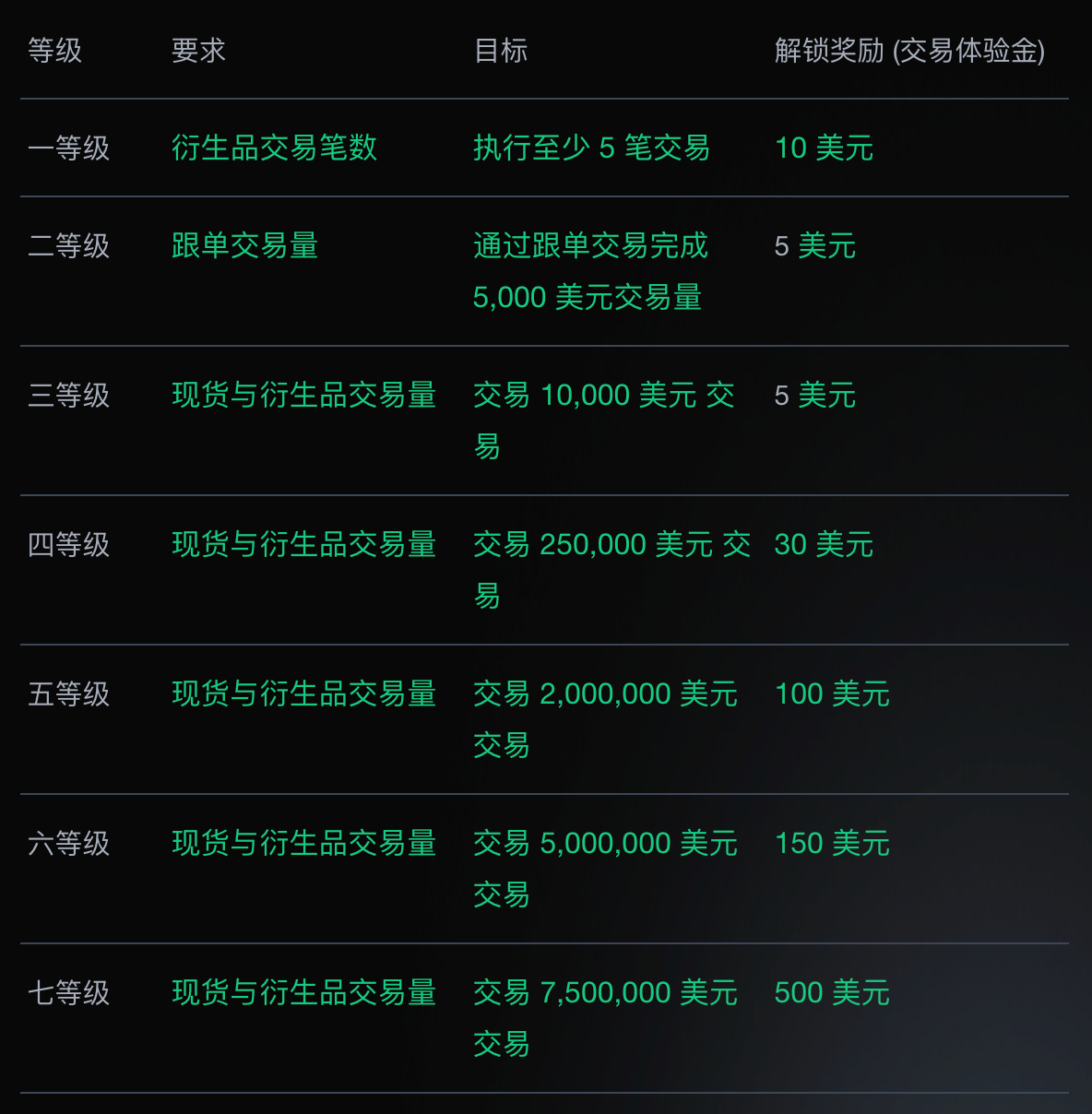 Advance through the trading tiers to unlock your share of the prize pool. To ensure your progress is tracked accurately, please refer to the table below for the calculation method of each tier.