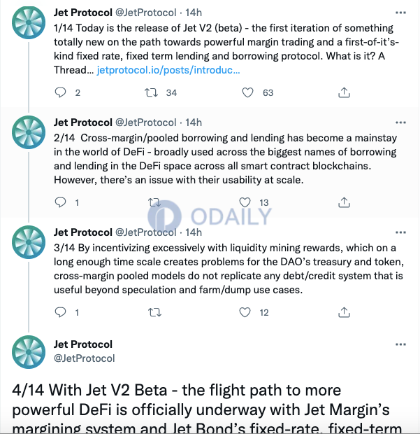 生态借贷协议Jet Protocol发布V2测试版,已上线保证金系统Jet Margin、固定利率市场Jet Bond和固定期限市场。