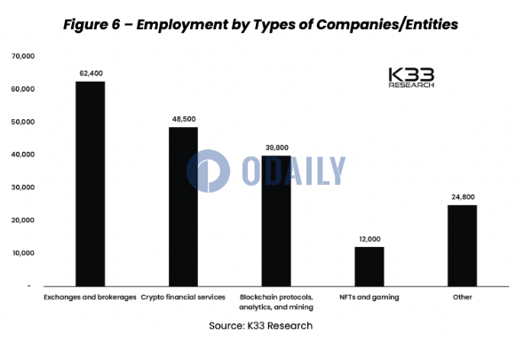 Researchers indicate that about one-third of the cryptocurrency workforce is employed in exchanges or brokerage firms. 26% of individuals are hired by companies offering various financial services related to cryptocurrencies.