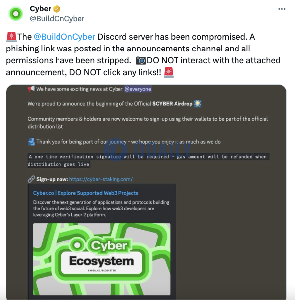 Odaily News Cyber posted on X that its official Discord server was attacked and a phishing link was posted in the announcement channel. The official reminded community users not to interact with the attached announcement and not to click on any links.