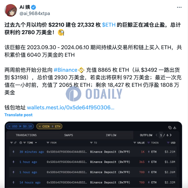 Odaily News According to on-chain analyst @ai_9684xtpa, the whale who built a position of 27,332 ETH at an average price of $2,210 in the past nine months is reducing his position to take profits, with a total profit of about $27.8 million. The whale continued to buy ETH from exchanges and chains from September 30, 2023 to June 10, 2024, accumulating a total of $60.4 million worth of ETH. Two weeks ago, he began to recharge 8,865 ETH to Binance in batches (from $3,492 to $3,198), with a total value of $29.3 million. If sold, he would make a profit of $9.72 million; the most recent recharge was an hour ago, with 2,065 ETH recharged; the remaining 18,427 ETH still has a floating profit of $18.08 million.