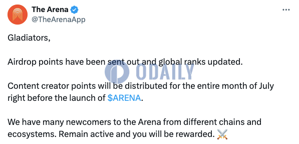 Odaily News The Arena, the Avalanche ecosystem social protocol, announced on X that the airdrop points have been issued and the global rankings have been updated. Content creator points will be issued throughout July before the launch of ARENA. Earlier news, The Arena announced on X that it has decided to postpone the launch of ARENA to July.