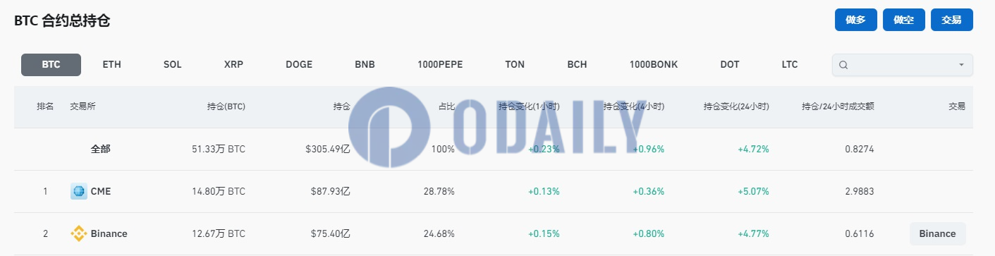 Odaily News Coinglass data shows that the total open interest of BTC futures contracts on the entire network is 513,300 BTC, equivalent to US$30.549 billion, with a 24-hour increase of 4.72%. Among them, the open interest of CME BTC contracts is 148,000 BTC (approximately US$8.793 billion), ranking first, with a 24-hour increase of 5.07%; the open interest of Binance BTC contracts is 126,700 BTC (approximately US$7.54 billion), ranking second, with a 24-hour increase of 4.77%.