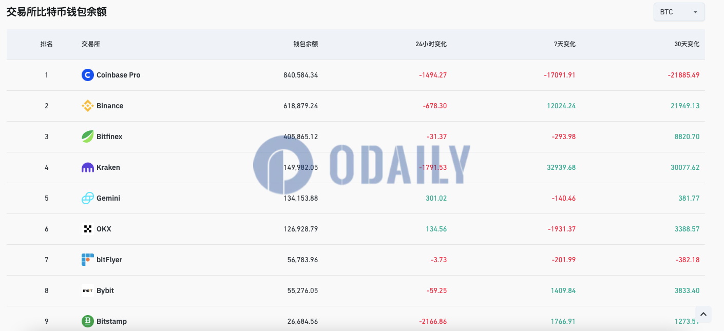 Odaily News According to Coinglass data, the current Bitcoin wallet balance of Coinbase Pro is 840,584.34, ranking first among CEXs; 1494.27 Bitcoins flowed out in the past 24 hours, 17091.91 Bitcoins flowed out in the past 7 days, and 21885.49 Bitcoins flowed out in the past 30 days. The Bitcoin wallet balance of Binance is 618,879.24 Bitcoins, with an outflow of 678.30 Bitcoins in the past 24 hours, an inflow of 12024.24 Bitcoins in the past 7 days, and an inflow of 21949.13 Bitcoins in the past 30 days. In addition, among the exchanges that executed compensation for Mt.Gox, the Bitcoin wallet balance of Kraken is 149,982.05 Bitcoins, with an outflow of 1791.53 Bitcoins in the past 24 hours, an inflow of 32939.68 Bitcoins in the past 7 days, and an inflow of 30077.62 Bitcoins in the past 30 days. The balance of the Bitstamp Bitcoin wallet is 26,684.56 coins, with an outflow of 2166.86 coins in the past 24 hours, an inflow of 1766.91 coins in the past 7 days, and an inflow of 1273.51 coins in the past 30 days.