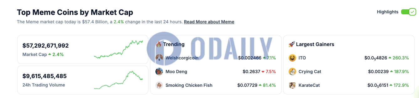 Odaily News CoinGecko data shows that the market value of the Meme coin sector is close to US$57.3 billion, with a 24-hour increase of 2.4%. The top three projects by market value have increased in the past seven days: DOGE increased by 19.3%, SHIB increased by 36.9%, and PEPE increased by 41.8%; the increases of other mainstream Meme coins in the past seven days are as follows: WIF increased by 37.7%, BONK increased by 33.5%, FLOKI increased by 26.6%, BRETT increased by 22.7%, MOG increased by 36.2%, MEW increased by 27.9%, NEIRO increased by 39.5%, and BABYDOGE increased by 34.7%.