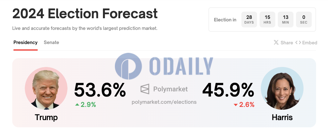 Odaily News Polymarket data shows that Trump's probability of winning the 2024 US presidential election has risen to 53.6%, while Harris' probability of winning the election has dropped to 45.9%.
