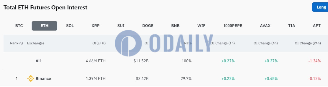 The open interest of Ethereum contracts on the entire network is US$11.52 billion, down 1.34% in 24 hours