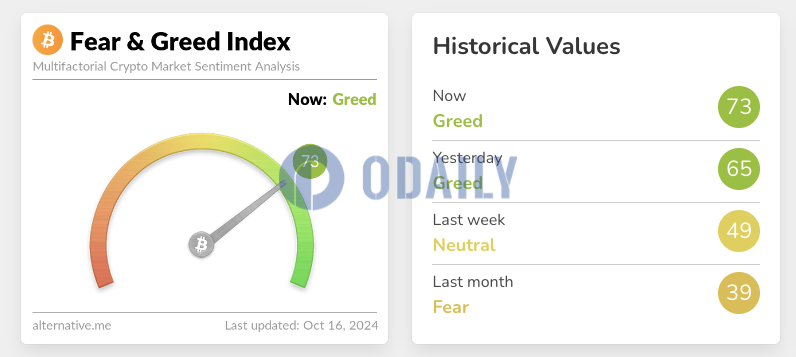 Today's Fear and Greed Index rose to 73, and the level is still Greedy