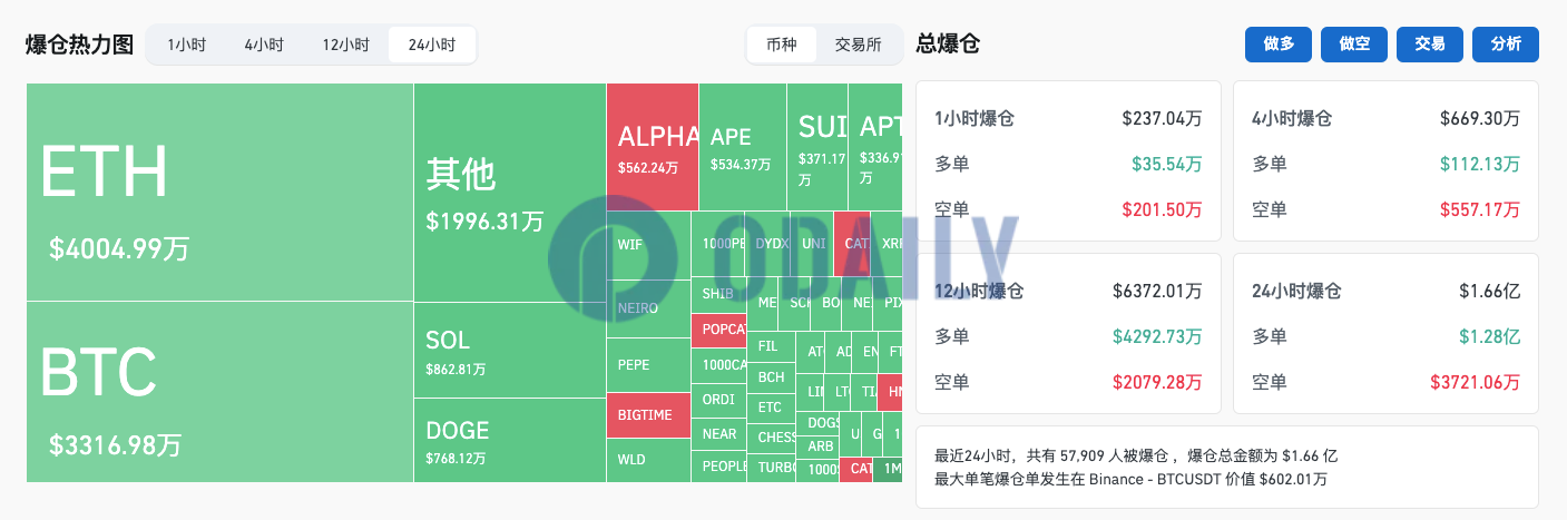 In the past 24 hours, the entire network has liquidated $166 million, mainly long orders, and the amount of ETH liquidation exceeds BTC