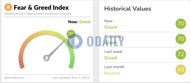 Odaily News Today's Fear and Greed Index is 70 (the same as yesterday), and the level is still greedy. Note: The threshold of the Fear Index is 0-100, including indicators: volatility (25%) + market trading volume (25%) + social media heat (15%) + market research (15%) + Bitcoin's proportion in the entire market (10%) + Google hot word analysis (10%).