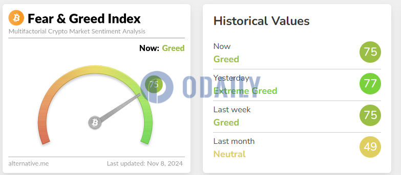 Today's Fear and Greed Index is 75, the level has changed from Extreme Greed to Greedy