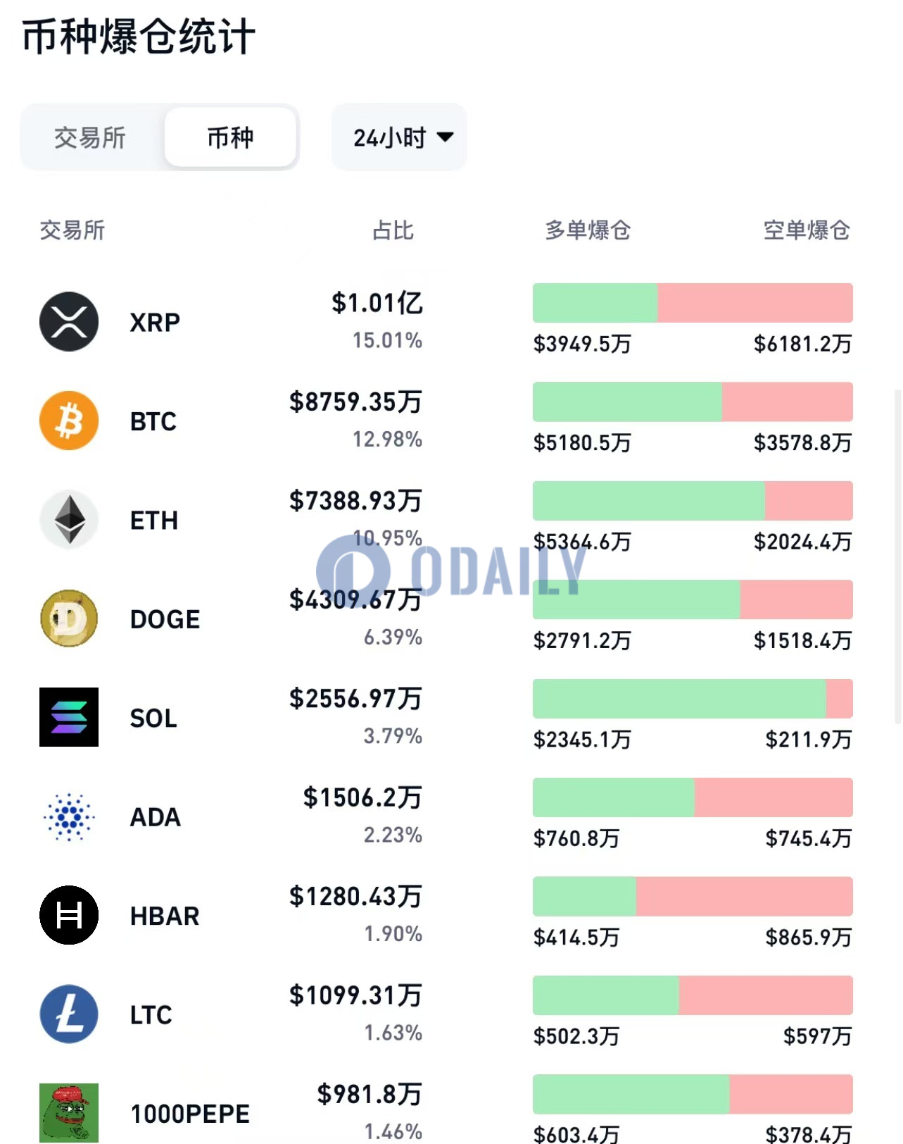 Odaily星球日报讯 Coinglass 数据显示,过去 24 小时 XRP 爆仓达 1.01 亿美元,为 24 小时内所有币种爆仓金额第一名。此外,过去 24 小时 BTC 爆仓 8759.35 万美元;ETH 爆仓 7388.93 万美元;DOGE 爆仓 4309.67 万美元。