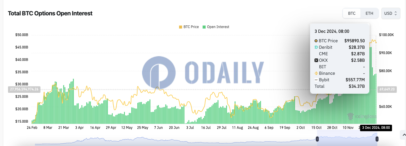 The total open interest of BTC options is $34.37 billion, and the open interest of ETH options is $8.7 billion.
