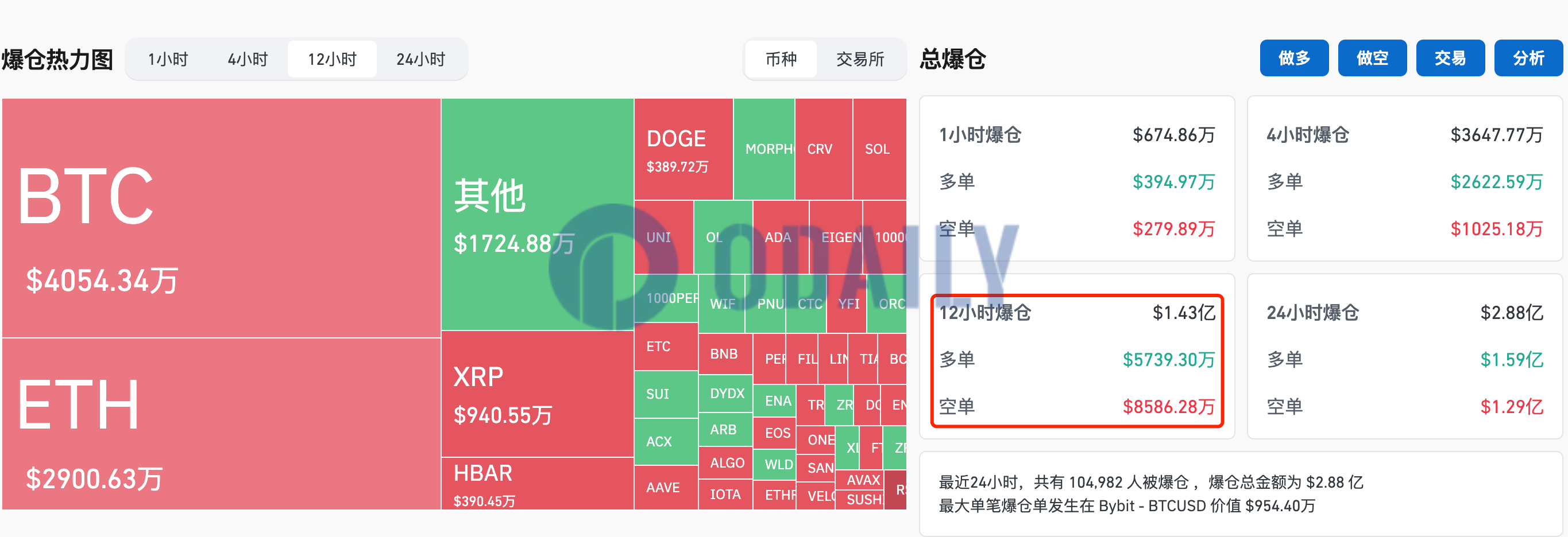 In the past 12 hours, the entire network has liquidated 143 million US dollars, mainly short orders