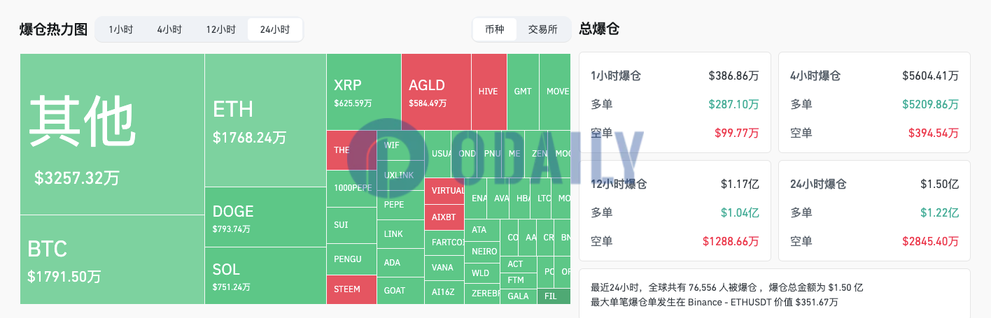 In the past 24 hours, the entire network has liquidated 150 million US dollars, mainly long orders