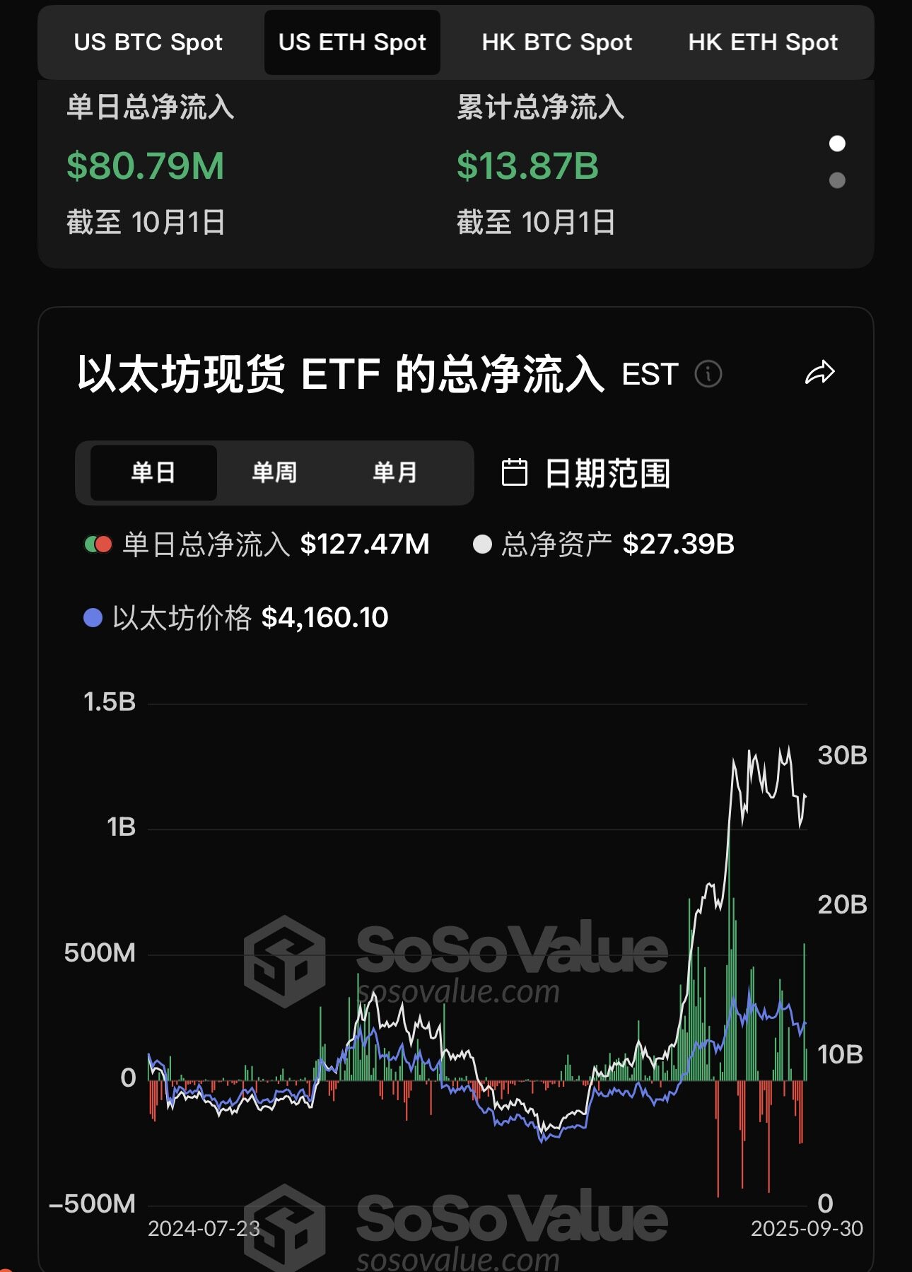 According to SoSoValue data, the total net inflow of Ethereum spot ETF was US$80.7908 million yesterday (October 1, US Eastern Time).