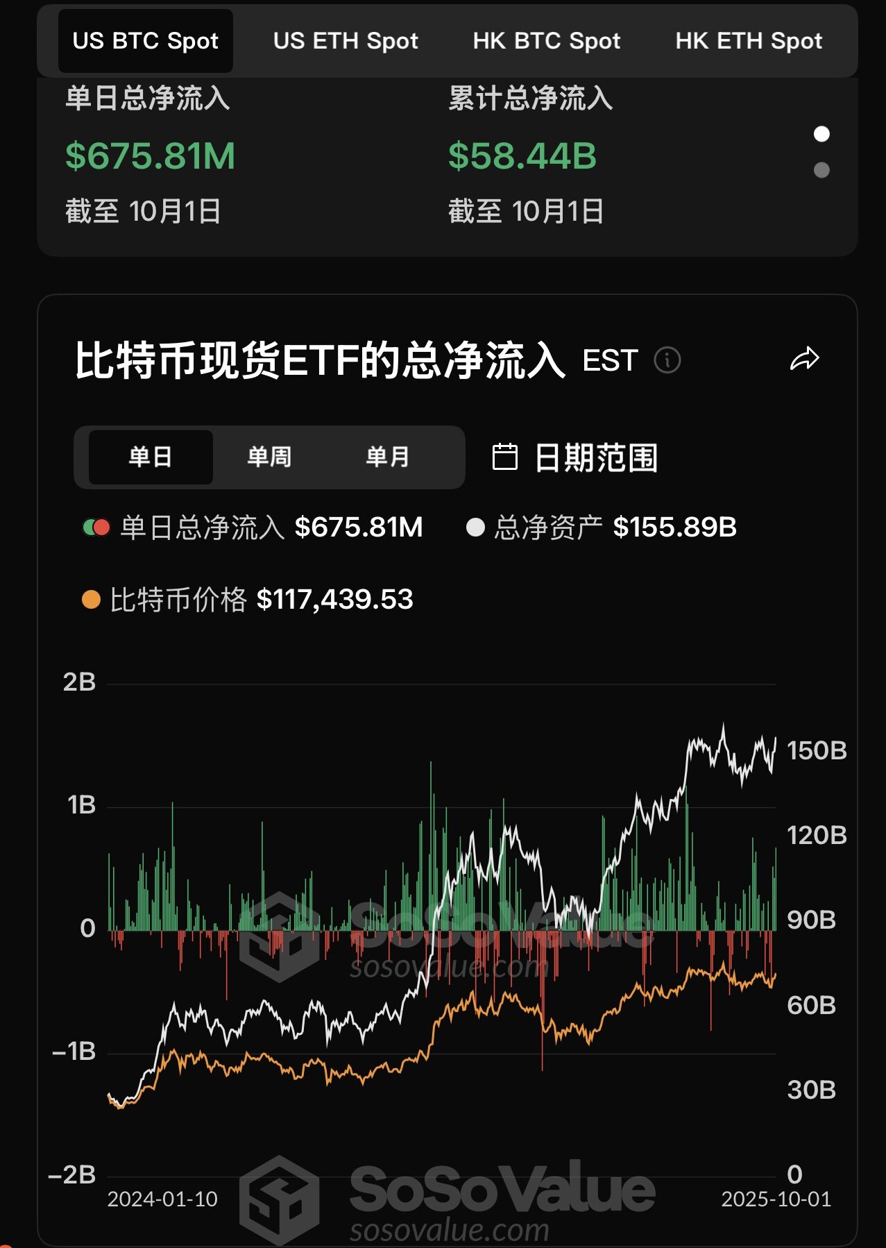 According to SoSoValue data, yesterday (October 1, US Eastern Time), the total net inflow of Bitcoin spot ETFs was US$676 million.