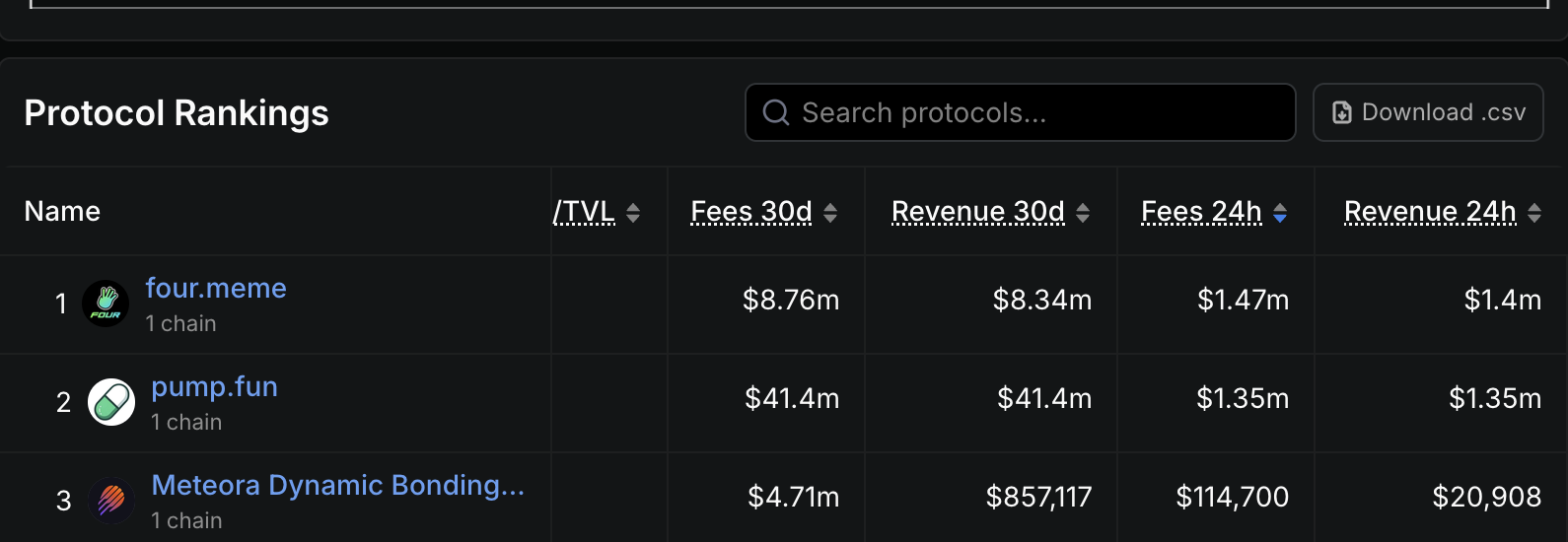 Four.meme's protocol revenue in the past 24 hours surpassed pump.fun