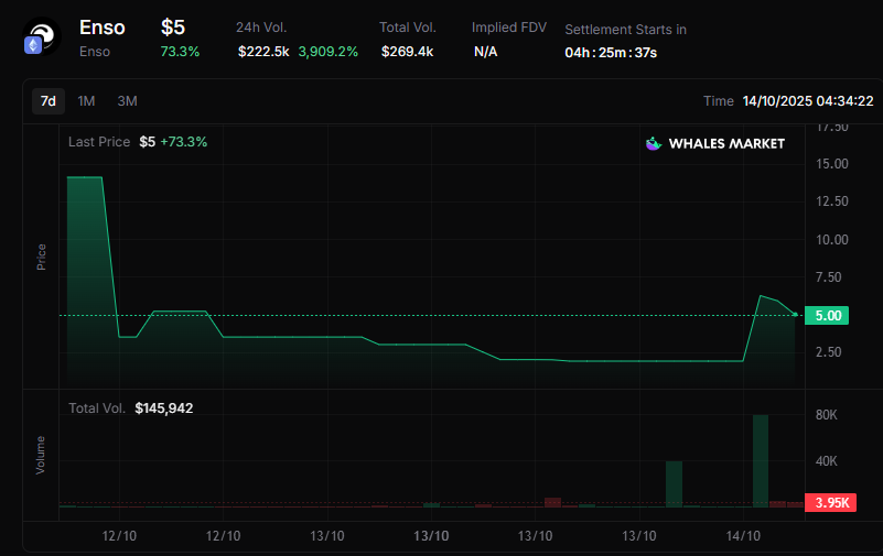 Odaily Planet Daily News: Whale Market pre-market data showed that the price of Enso (ENSO) rose to US$5, a 24-hour increase of 73.3%.