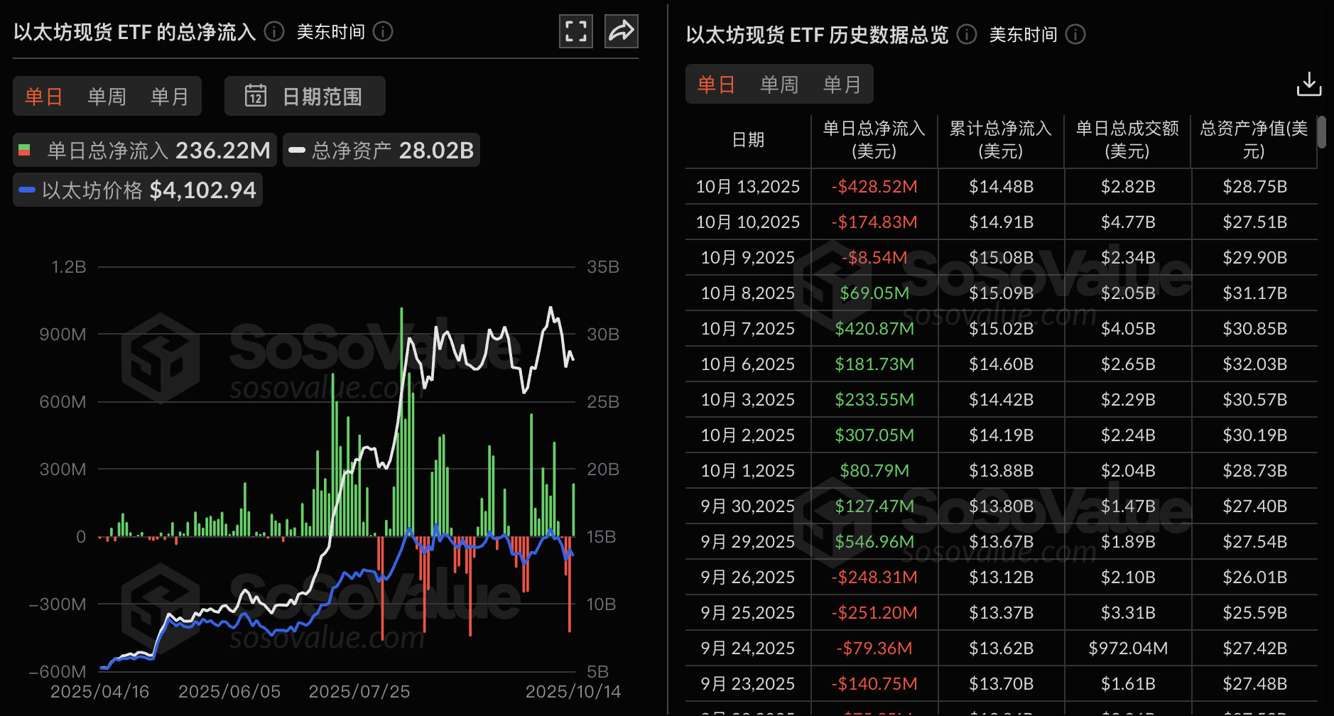 According to SoSoValue data, the Ethereum spot ETF had a total net inflow of US$236 million yesterday (October 14, US Eastern Time).