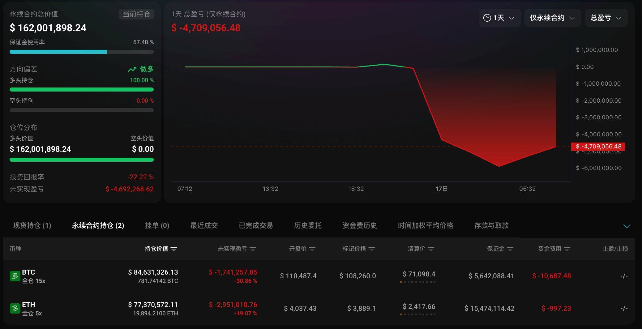 According to on-chain analyst @ai_9684xtpa, a major whale account previously profited $2.683 million from a $140 million short position, but has since relinquished all of that profit. Last night, the whale significantly increased its long position, bringing its total holdings to $162 million, including approximately $84.67 million in BTC and $77.43 million in ETH. Currently, the account's overall floating loss is approximately $4.69 million.