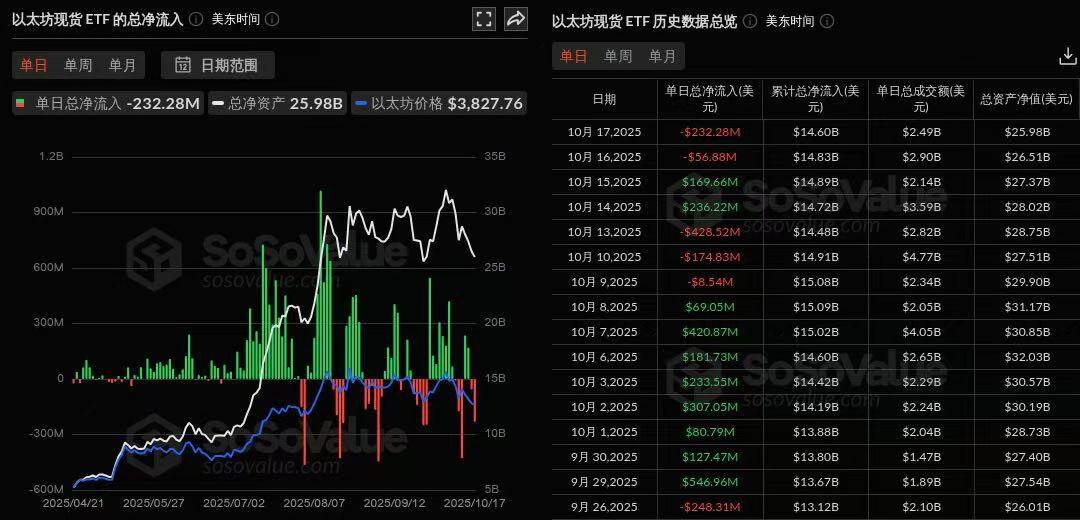 According to SoSoValue data, the Ethereum spot ETF had a total net outflow of US$232 million yesterday (October 17, US Eastern Time).