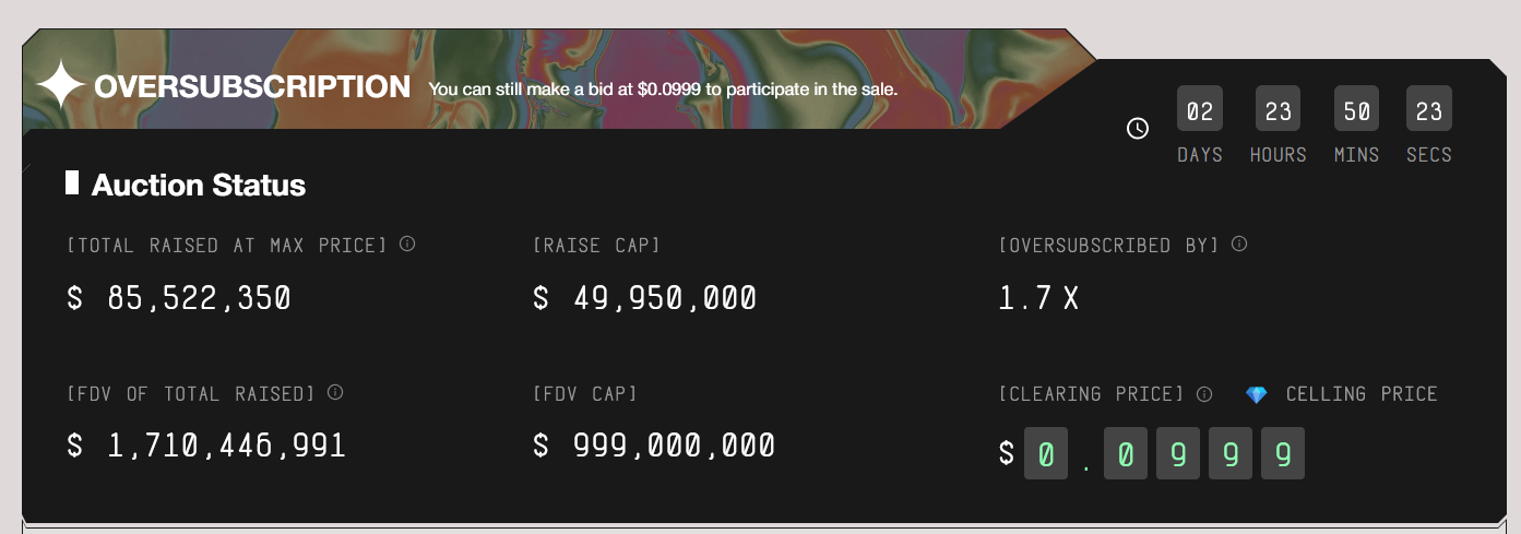Odaily Planet Daily reports that MegaETH has launched its public sale on Echo's Sonar platform. 500 million of the total 10 billion MegaETH supply will be offered for sale in USDT. Users can bid via an English auction, with a maximum bid of $186,282 and a minimum bid of $2,650. The starting price is $0.0001 (with a FDV of $1 million) and the maximum price cap is $0.0999 (with a FDV of $999 million).