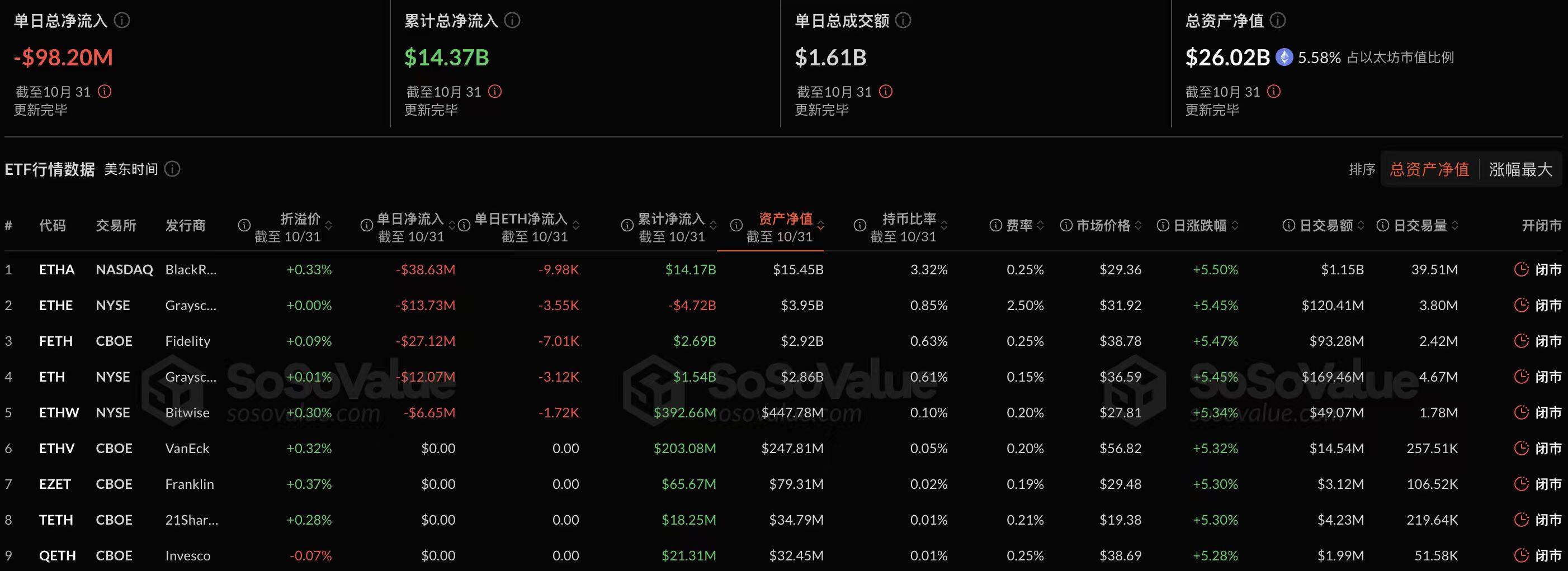 As of press time, the Ethereum spot ETF has a total net asset value of $26.02 billion, an ETF net asset ratio (market capitalization as a percentage of Ethereum's total market capitalization) of 5.58%, and a historical cumulative net inflow of $14.37 billion.