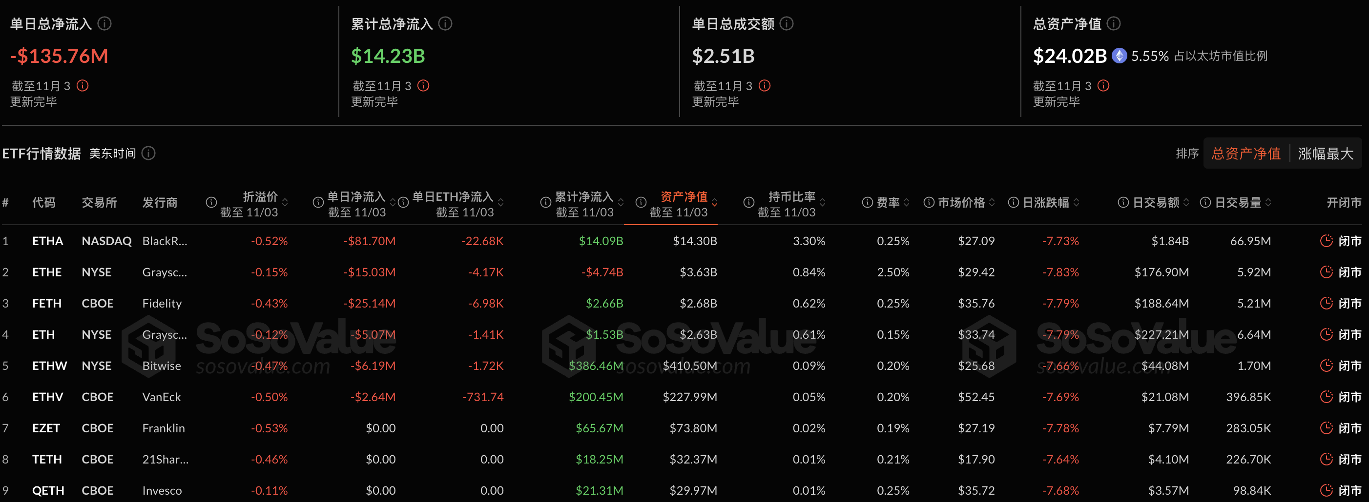 According to data from SoSoValue, Ethereum spot ETFs saw a net outflow of $136 million yesterday (November 3rd, Eastern Time).