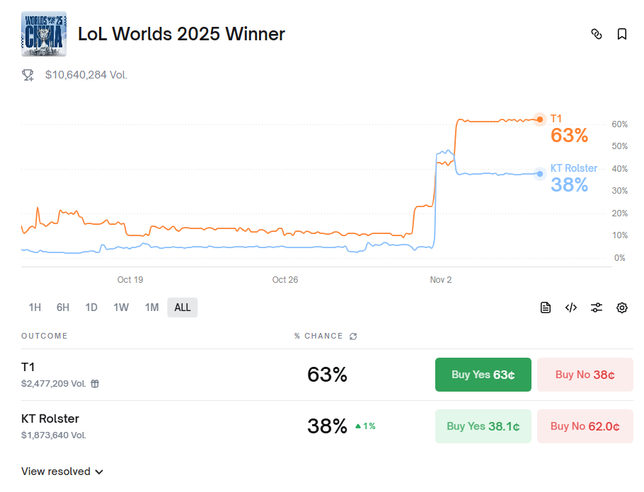 Polymarket predicts that the "League of Legends S15 World Championship" will see over $10 million in trading volume, with T1 having a 63% chance of winning.