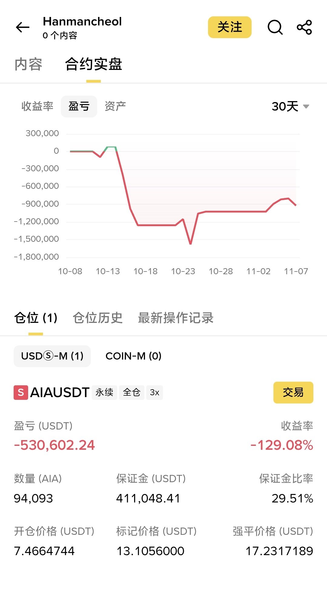According to Binance data, Odaily Planet Daily reports that the live trading smart money account Hanmancheol shorted the token AIA at an average opening price of $7.46. With the current mark price at $13.1, the account has incurred a loss of $530,000.