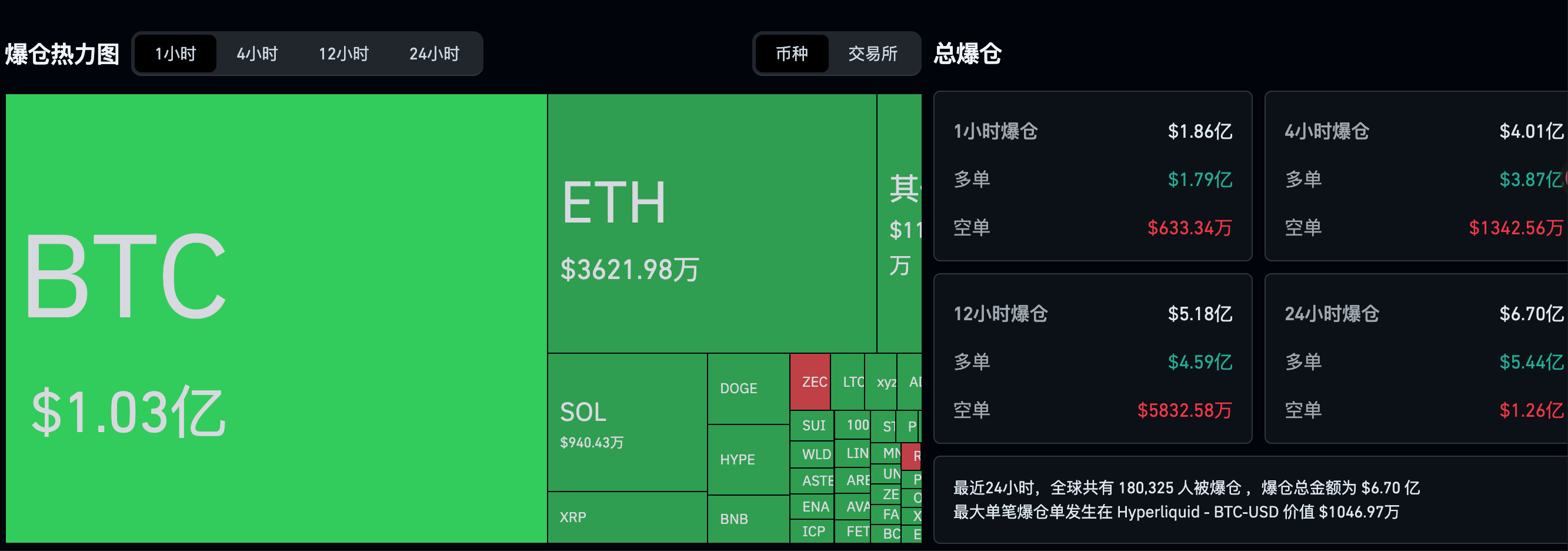 According to data from Coinglass, as reported by Odaily Planet Daily, $186 million in positions were liquidated across the network in the past hour, including $179 million in long positions and $6.3334 million in short positions. Furthermore, over 180,000 individuals experienced liquidations in the past 24 hours, with a total liquidation amount exceeding $670 million.