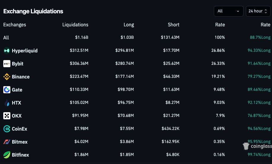 According to data from Coinglass, nearly $1.2 billion in cryptocurrency positions were liquidated in the past 24 hours, including approximately $1 billion in long positions.