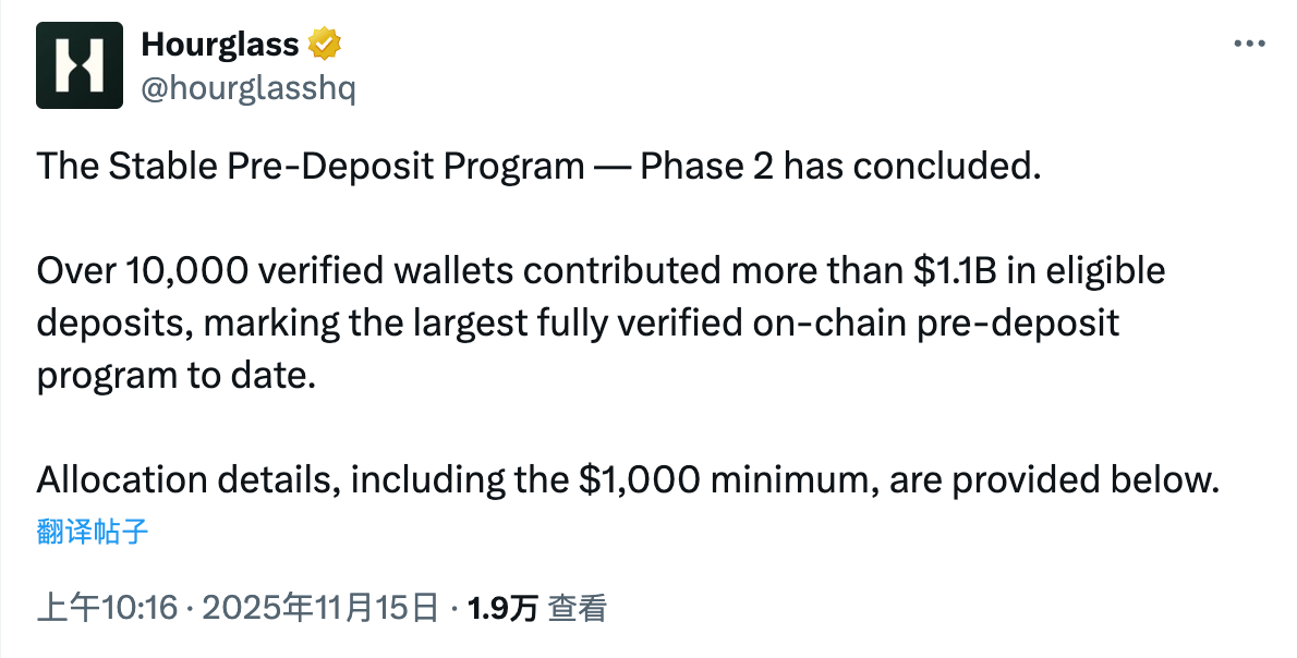 Hourglass: Stable pre-deposit phase two concludes, with over 10,000 verified wallets contributing over $1.1 billion in eligible deposits.