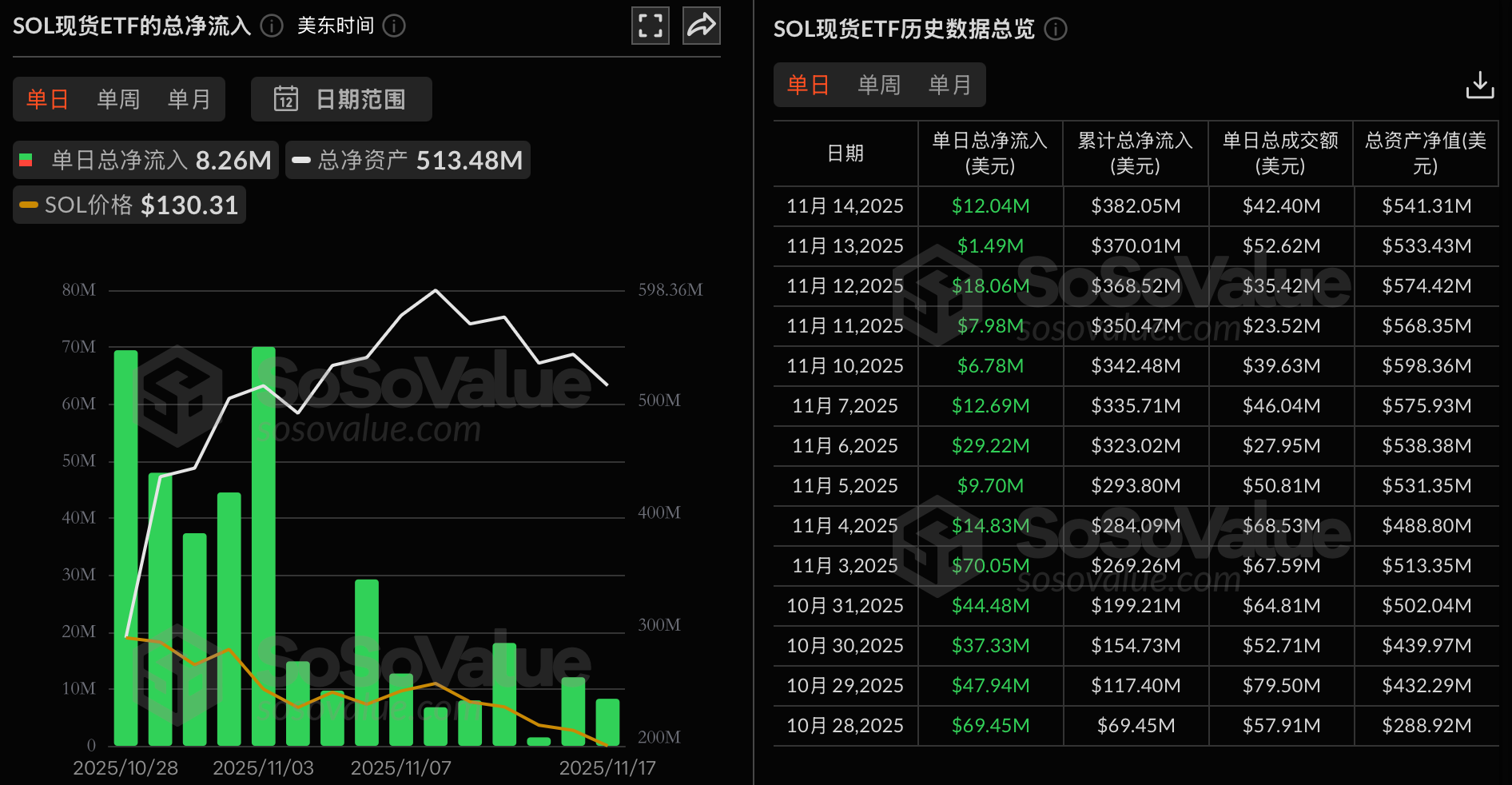 As of press time, the Solana spot ETF has a total net asset value of $513 million, a net asset value ratio of 0.71%, and a cumulative net inflow of $390 million.