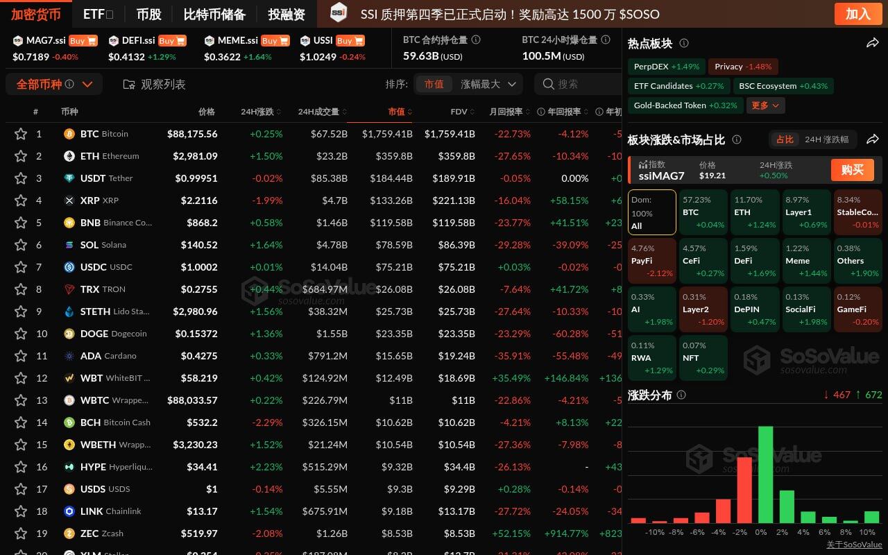 According to data from SoSoValue, most crypto markets rose, with the AI sector up 1.98% in the last 24 hours. Bittensor (TAO) rose 7.29%, and KAITO (KAITO) rose 12.53%. Meanwhile, the SocialFi sector rose 1.98%, with Toncoin (TON) rising 2.96% within the sector. Additionally, Bitcoin (BTC) rose 0.04%, surpassing $88,000; Ethereum (ETH) rose 1.24%, approaching $3,000.